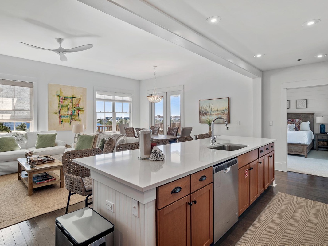 With 1,600 square feet of living space, this sizeable condominium is perfect for entertaining friends and family. The open floor plan is bright and airy, with natural light flooding in from the large picture windows that frame the emerald waters below. A cozy yet roomy living area offers comfortable seating with a linen Couch, a loveseat, and one armchair in front of the TV . The natural wood cabinets, stainless appliances, and a large island/ breakfast bar seat five and make it easy to cook up an old family recipe. At the same time, the 6-person dining table provides ample space for eating and reconnecting. A large furnished balcony, accessible from the great room and primary bedroom, delivers breathtaking sunrise and sunset views of the Gulf. Down the hallway, a full-sized washer and dryer are available for use, as well as the four tranquil bedrooms—1 spacious primary bedroom, two guest bedrooms, and one bunk area with two twin-over-twin beds.