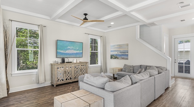 Cheerful blue accents and chic beach décor mix with elegant fixtures and furnishing inside this tasteful home. Natural light shines off the beautiful hardwood floors and highlights the glamorous coffered ceiling in the open-concept great room, which offers ample space to relax with family and friends. The soft, spacious sectional couch entices guests to gather for a movie night on the 55" TV. Epicureans will delight upon seeing the white marble countertops and Samsung appliances in the fully stocked kitchen. Prepare an evening meal to share at the traditional dining table that seats up to 6 with a mix of chairs and bench seating, with 4 additional seats at the breakfast bar. Out the back door awaits a screened-in porch with a Weber propane grill and 2 chairs—the perfect spot to spend a laid-back afternoon barbecuing the catch of the day!