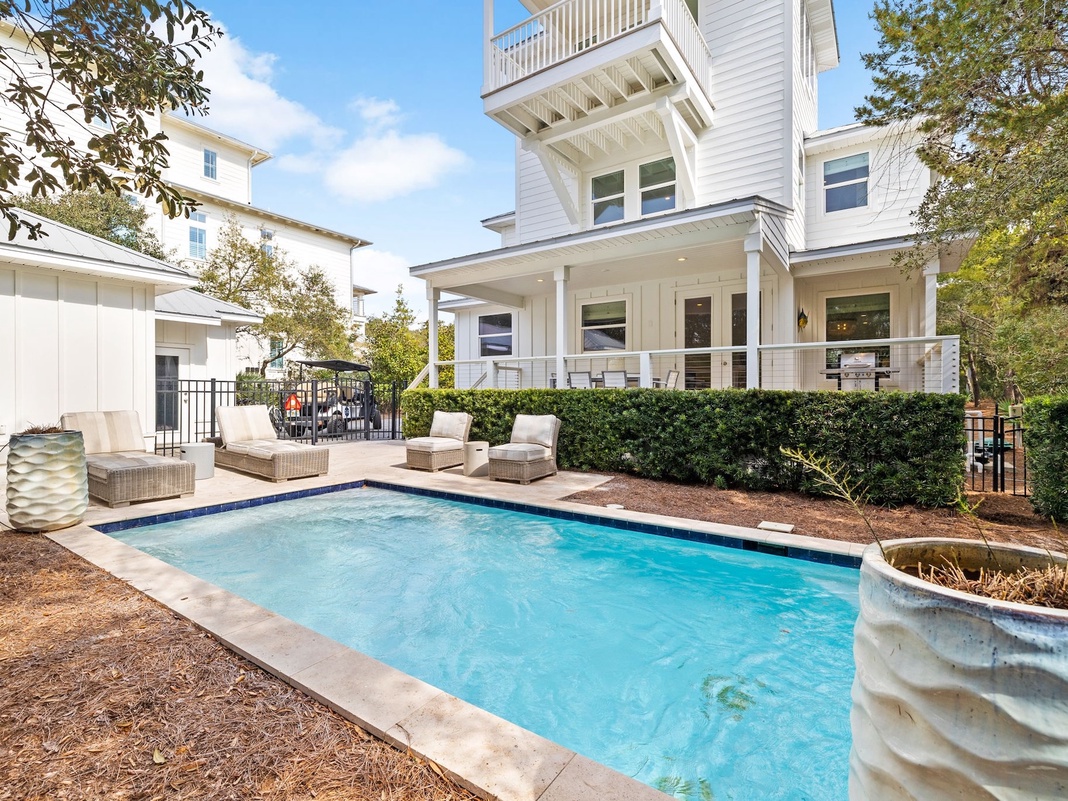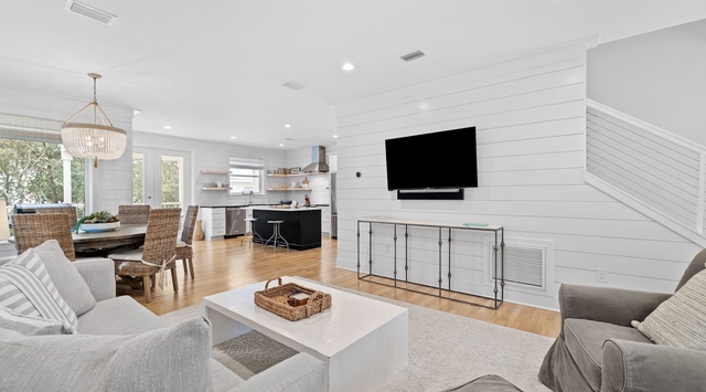 Relaxation starts the moment guests arrive at this 3-story home. A spacious front porch with a bench swing and chairs encourage sleepy mornings sipping coffee in the fresh air. Inside, shiplap walls, wicker accents, and blonde wood floors create a beachy and cheerful vibe throughout the first-floor great room. Curl up on the comfy couch and 2 armchairs with glasses of white wine and a bowl of popcorn to watch TV in the living area, which seamlessly connects to the dining space with a round table for 6. The open-concept kitchen is a chef’s dream, with high-end appliances and a roomy island that doubles as a breakfast bar for 2. On the back porch, a 6-seat table and grill inspires alfresco dining. Head down to the pool deck and soak up sunshine from the 2 chairs or 2 loungers. An outdoor shower makes it easy to rinse off after beach trips. When it’s time to retire for the night, there is 1 guest bedroom with a king bed and a private bathroom on this level. Additionally, there’s a convenient laundry room with space for storing beach bags.