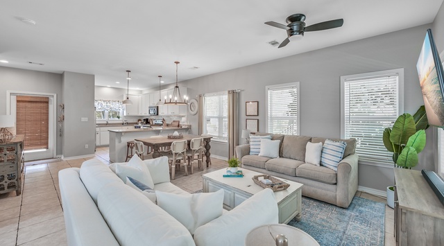 The home is located pretty much across the street from beach access. It is a golf cart ride away from everything. We trekked all over Santa Rosa in the golf cart which was such a nice addition. The home is just a few miles away from other towns which we went to visit, specifically Rosemary Beach and Seaside. We loved how private the neighborhood was and how safe it felt compared to the hustle, bustle, and traffic in both Seaside and Rosemary Beach.