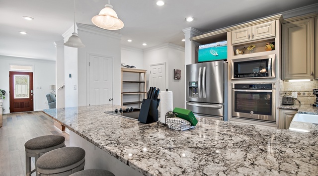 Casa de Luz features a pillar facade, an open-air front porch veranda, and an upper-level covered balcony to enjoy the Gulf breeze. The first floor provides plenty of natural lighting through picture windows. The living room includes a queen sleeper sofa and armchair facing a small fireplace and TV—the perfect venue for gathering with loved ones for vacation movie night! A cozy dining area just off the living room offers table seating for 8. The adjoining kitchen is fully equipped with granite countertops, stainless steel appliances, and even a TV. Additional seating is available at the kitchen island with seating for 4. Alfresco dining with seating for 4 is available on the patio. Here guests will find a gas grill. A laundry room is also conveniently located on the first floor.