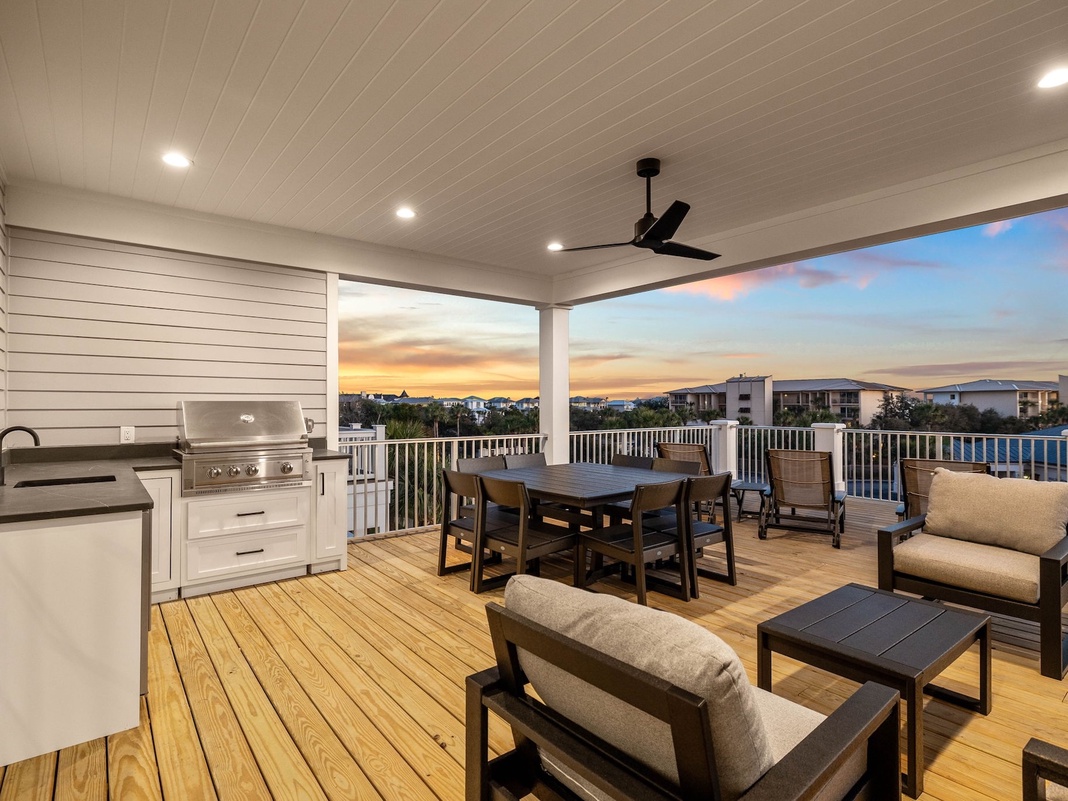 The fun continues in the top-level lounge featuring a TV, queen sleeper sofa, and 2 armchairs. Adjacent is a guest bedroom with a queen bed and a private balcony. The gem of this home is the spacious covered deck, which invites guests to spend time outside, with an outdoor kitchen, an 8-seat table, sun loungers, soft seating, and even an outdoor shower. Sip cocktails while enjoying glimpses of the Gulf and the cooling breeze from the overhead fan.
