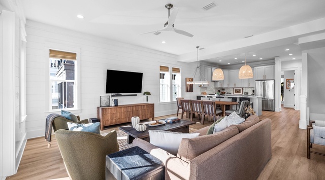 DETAILS: Welcome to 3 Palms, a stunning 4-bedroom, 4-bathroom Seacrest Beach home that sleeps 12 guests. This alluring beach town is known for its natural beauty and charming Peddler’s Pavilion. Spend carefree days sampling the local eateries, swimming in the community pool, or lounging on the beach—only a 9-minute walk away. Guests will love the multiple outdoor spaces, including a top-floor patio with peek-a-boo Gulf views.