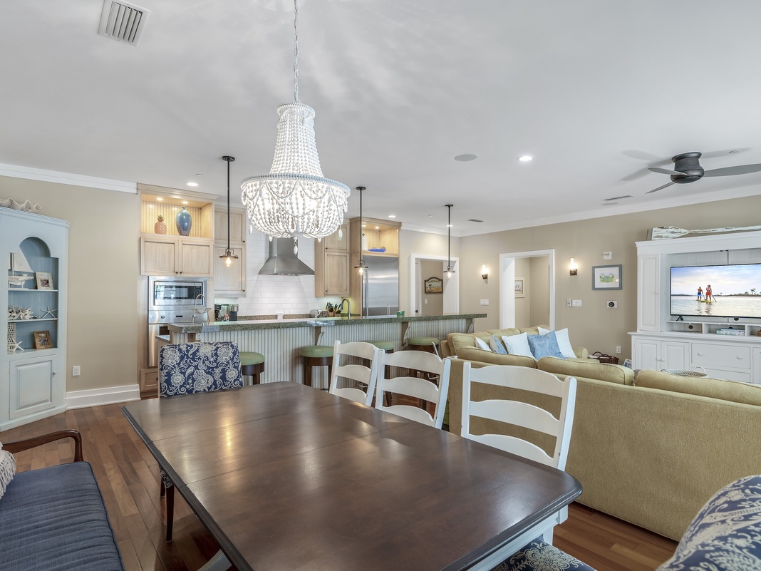 Step into this stunning condo and be greeted by natural light streaming through the expansive windows and doors, creating a warm and inviting atmosphere in the great room. The plush furnishings, including a queen sleeper sofa, provide comfort, while the 55" TV provides entertainment. Take in garden views from the spacious private patio, perfect for relaxation and enjoyment. A professionally designed kitchen showcases a multitude of upgrades, including beautiful granite countertops, an eye-catching backsplash, and high-end Viking appliances. The breakfast bar comfortably seats 5 for a casual meal, while the traditional dining table accommodates 8 with a mix of chair and bench seating. For added convenience, there's a laundry room down the hallway. When it's time to turn in for the night, guests can unwind in 3 cozy bedrooms. The primary bedroom offers a royal experience with a king-sized bed and a luxurious private bathroom with a walk-in shower and separate soaking tub. Plus, access to the rear patio for a breath of fresh air. A well-appointed guest bedroom provides a full-sized bed and a private bathroom. The bunk room boasts a twin-over-twin bed and a full-over-full bed, perfect for younger guests or those young at heart. All 3 bedrooms include a TV for entertainment.