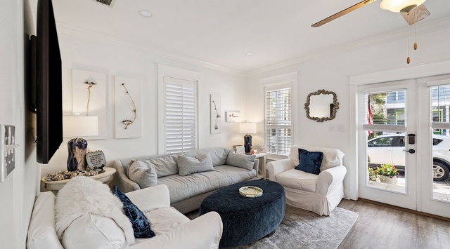 An inviting front porch with Adirondack chairs welcomes guests to How Sweet It Is. Around the corner, guests can enjoy a hanging bench swing and an outdoor shower. Stepping inside the home, guests will find a coastal chic open living, dining, and kitchen area decorated in pale shades of cream, gray, and driftwood. Slipcovered sofas and chairs are split into two gathering spaces. Guests can curl up on the sofa and enjoy the 65” Smart TV or unwind on cozy armchairs and share stories of the day. An oval dining table seats 6 and leads to a kitchen with marble counters and luxurious extras like a wine cooler, a cappuccino machine, and a touch-activated faucet. Off the kitchen is a guest bedroom with a king bed and a private bathroom.