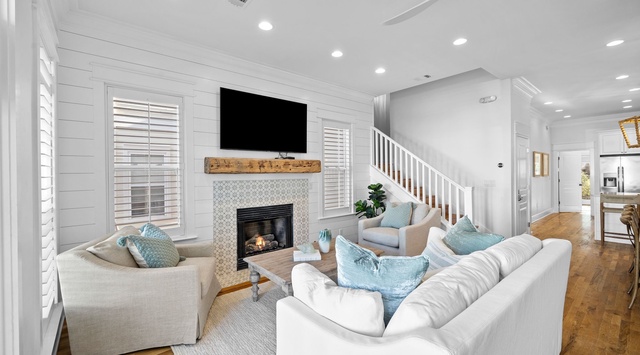 Shiplap walls, splashes of aquamarine, warm woods, and a beachy bead chandelier all add to the refined charm throughout the first-floor great room of this bright, beautiful home. In the living space, 2 matching armchairs and a sofa frame the TV, offering an intimate spot to enjoy movies or relaxed catch-up sessions. Beyond the living space is a dining table for 10, with 4 extra seats at the nearby breakfast bar. The chef of the group will delight in the spacious countertops and high-end appliances in the open kitchen, boasting a glass induction stove and a wine cooler. Out the back door is a propane grill for barbecues. A serene guest bedroom with a king bed, private bathroom, and Smart TV is on this level—early risers will love the private back porch, which leads out to a walking trail. A washer and dryer add convenience for extended stays.