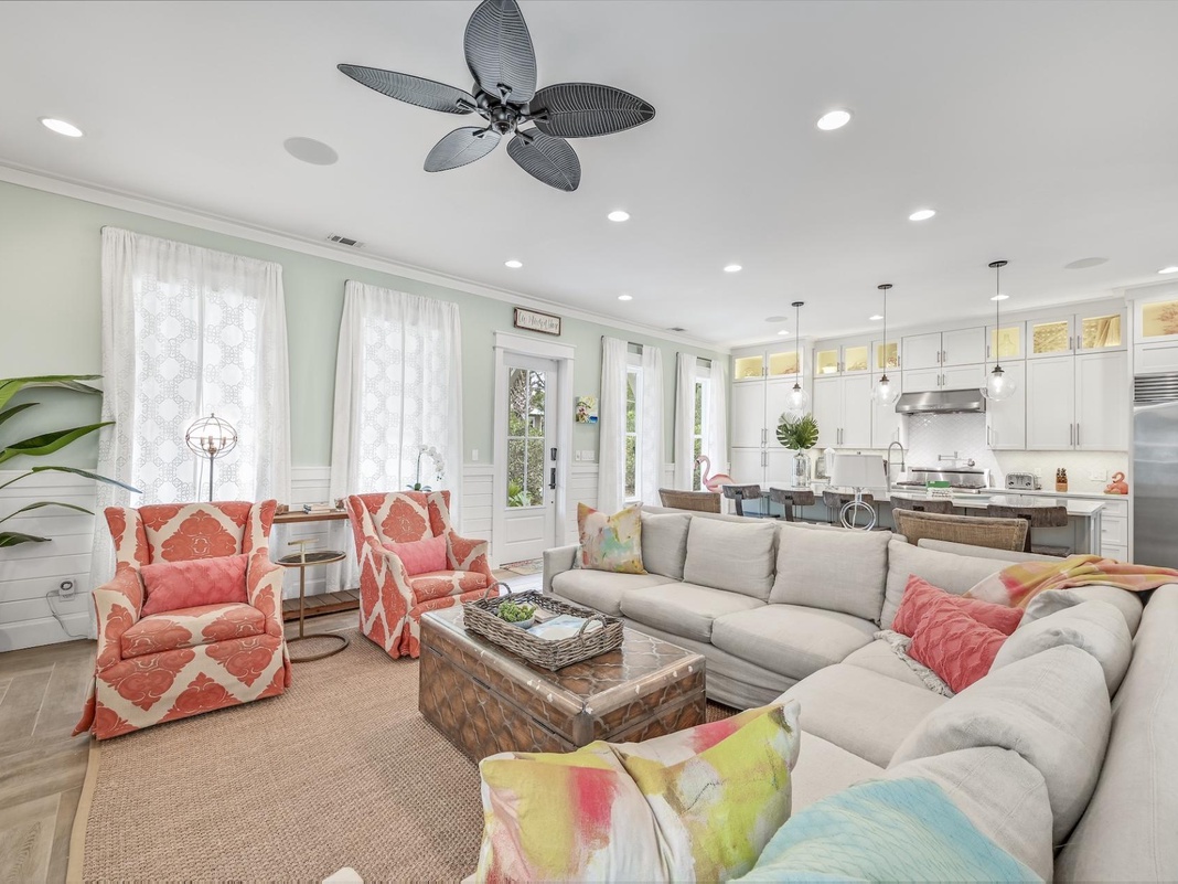Guests are welcomed to this spacious home by a classic front porch with gorgeous pillars. Inside, the open layout includes elegant vaulted ceilings, wood-like tile, and large picture windows. The gourmet kitchen boasts quartz countertops and top-of-the-line Sub-Zero and Thermador appliances—plus a 5-stool breakfast bar/kitchen island. An adjoining formal dining room seats 6. Friends and family will love the living area, which is decorated in subtle nods to the beach, like 2 coral-colored armchairs and matching accent pillows on the wraparound sectional couch. There is also 1 guest bedroom located on this floor.
