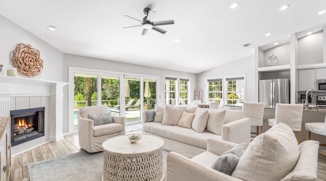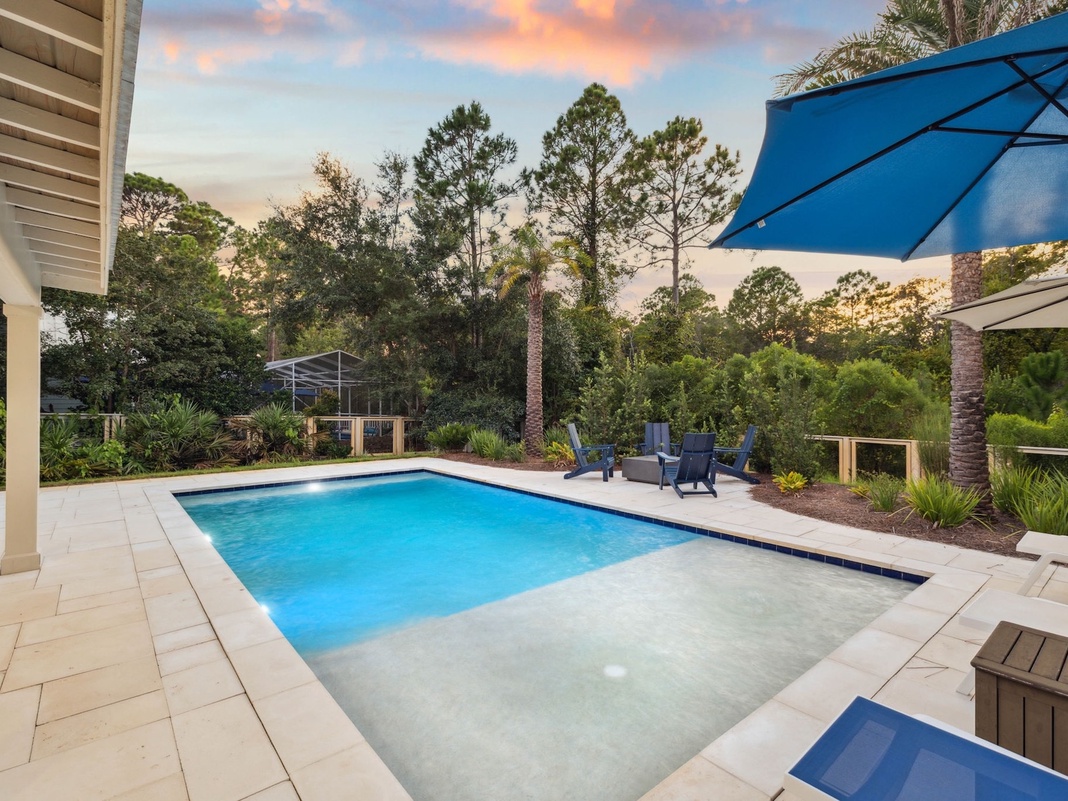 Embodying seaside sophistication, this beautifully decorated home flows seamlessly within an open floor plan that's bathed in natural light, illuminating the serene beige and creamy white coastal palette. Plush, slip-covered furniture beckons with its soft and inviting charm, balancing laid-back comfort and understated luxury. Whether it's a quiet conversation or mapping out the day's activities, the living area was designed to bring the whole family together. A fully equipped kitchen featuring high-end appliances, pantry, and Keurig-Duo coffee maker is perfect for preparing breakfast, lunch, or dinner. The nearby dining table seats 6 in a circle, plus 4 more at the adjacent breakfast bar, providing ample space for shared meals. The heart of the home lies in the sprawling outdoor haven, complete with a large pool deck and fenced-in backyard. Soak up the sun next to the peaceful private pool or sip cocktails from the alfresco table for 4 while the kids and dogs play freely in the yard. After a busy day at the beach, take advantage of the convenient washer and dryer, then unwind in 3 comfortable bedrooms, each with a TV. The luxurious primary bedroom features a king bed, private bathroom, and easy outdoor access. A welcoming guest room with a queen bed sits alongside a playful bunk room featuring 2 twin-over-full beds, perfect for kids!