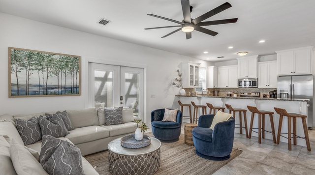 Enjoy fresh coastal breezes from the front porch of The Happy Seahorse with matching outdoor furniture and a blue facade. This modern home welcomes guests in with natural textures and colors that create a subtle beachy vibe. The open-concept kitchen, dining, and living area are great for gathering, socializing, and unwinding. The living area is perfect for relaxing with its large sectional sofa, 2 comfy armchairs, a TV, and a ceiling fan. The adjacent farmhouse-style dining table seats 6 guests with a lovely chandelier hanging above. The bright and airy kitchen is fully equipped with all the conveniences of home, including a sizeable 6-stool breakfast bar, Keurig and Nespresso coffee makers, a beverage cooler, and more. Also, a primary bedroom can be found down the hallway, along with a full-size washer and dryer. To step outside and enjoy the sunshine, take the doors through the living area to the pergola-covered patio, wooden walking path, outside shower, and gas grill. The perfect outdoor space for entertaining!