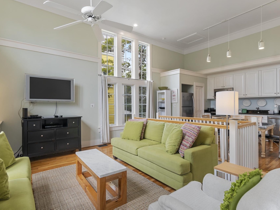 Guests will find a bright living space and combined eat-in kitchen filled with natural light upstairs. Spend a sunny morning making breakfast to share at the 6-person table. In the living area, 2 Spring green couches and an armchair surround the TV and provide a cozy place to unwind from a day of beach fun. There are 3 glass double doors that open to the covered balcony with rocking chairs and a wicker table for 4—the perfect spot to savor an evening cocktail.