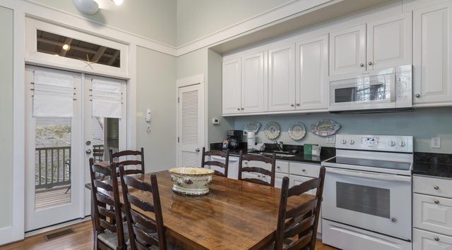 On the top floor, high windows fill the communal living spaces with natural light. A soft sofa and armchairs create an intimate and comfortable place to gather for a night of drinks and laughter or watching TV. The eat-in kitchen has plenty of counter space and a table for 6 to savor a meal! Open the multiple glass doors that lead to the balcony and enjoy the salty air or dine alfresco at the 6-person covered outdoor table as the overhead fan provides a cool breeze.