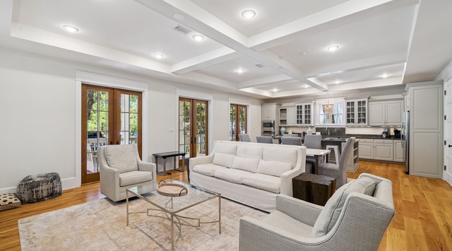 A bright yellow façade and charming front porch with a bench swing and Adirondack chairs set the tone of joy and relaxation upon arrival—curl up with the latest beach read or savor iced tea beneath the overhead fan’s gentle breeze. French doors lead into the first-floor great room, accented by a refined coffered ceiling. To one side is the living space, where a soft sofa and 2 matching armchairs surround a 70” Smart TV. The opposite side of the great room hosts the chef’s kitchen, fully equipped with GE appliances and plentiful counter space. Entertain loved ones and mini taste-testers at the 4-seat breakfast bar and island, which overlooks the 6-person dining table and living area. At the back of the home is a screened-in porch furnished with a table, wicker chairs, and an overhead fan. When the night ends, the primary bedroom with a king bed, private bathroom, and back porch access provides a serene retreat. Additionally, there’s a sleeping nook on this floor with a twin-over-twin bunk bed—each bunk has an individual TV for entertainment.