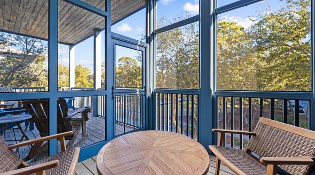 There is also a bunk room off the living area with a twin-over-full bunk bed and direct access to the screened-in porch with new outdoor seating. This bunk shares a bathroom with shower with additional guests to utilize and a back porch with sunny views of the neighborhood.