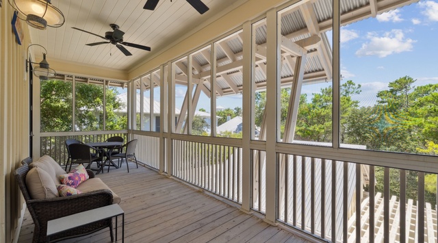 Upstairs, a secondary living space with a curved sectional, TV, and 4-person table provides plenty of room to spread out—or a cool hangout spot for the kids! Through the French doors, discover a covered balcony with patio seating and rocking chairs for unwinding in the fresh air. The 2 guest bedrooms respectively feature 1 king bed and 2 twin beds and share access to a furnished, screened-in porch. For extra sleeping accommodations, the office has 1 daybed with 1 twin trundle, and the living area has 1 queen sleeper sofa.