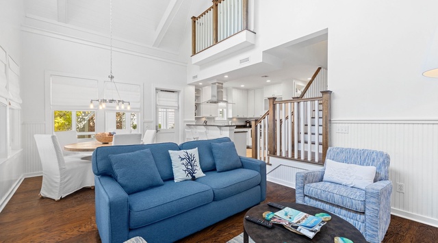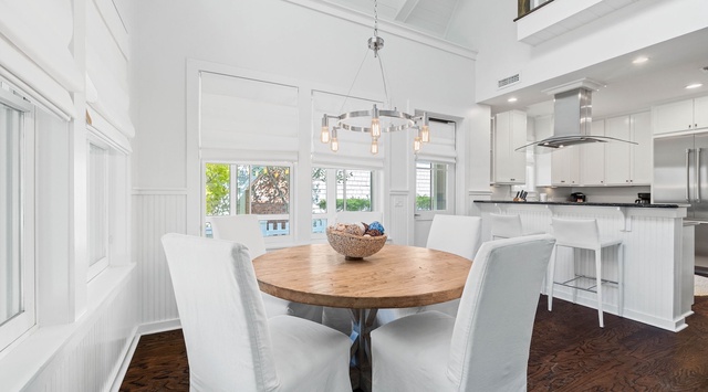 A screened-in front porch, perfect for enjoying a nice coastal breeze, welcomes guests to this 2-story home. The first-floor great room mixes the living, dining, and kitchen areas together seamlessly with professional coastal décor that creates a calming space. A breathtaking wall of windows illuminates the living area adorned with plush white slipcover furniture situated in front of the fireplace with a TV mounted overhead. The elegant kitchen has sleek white cabinetry, dark marble countertops, and high-end appliances. A traditional dining area comfortably seats 5 guests around the table, while the quaint breakfast bar can seat 2 more. There are 2 guest bedrooms located on this floor, both with king beds and stunning views.
