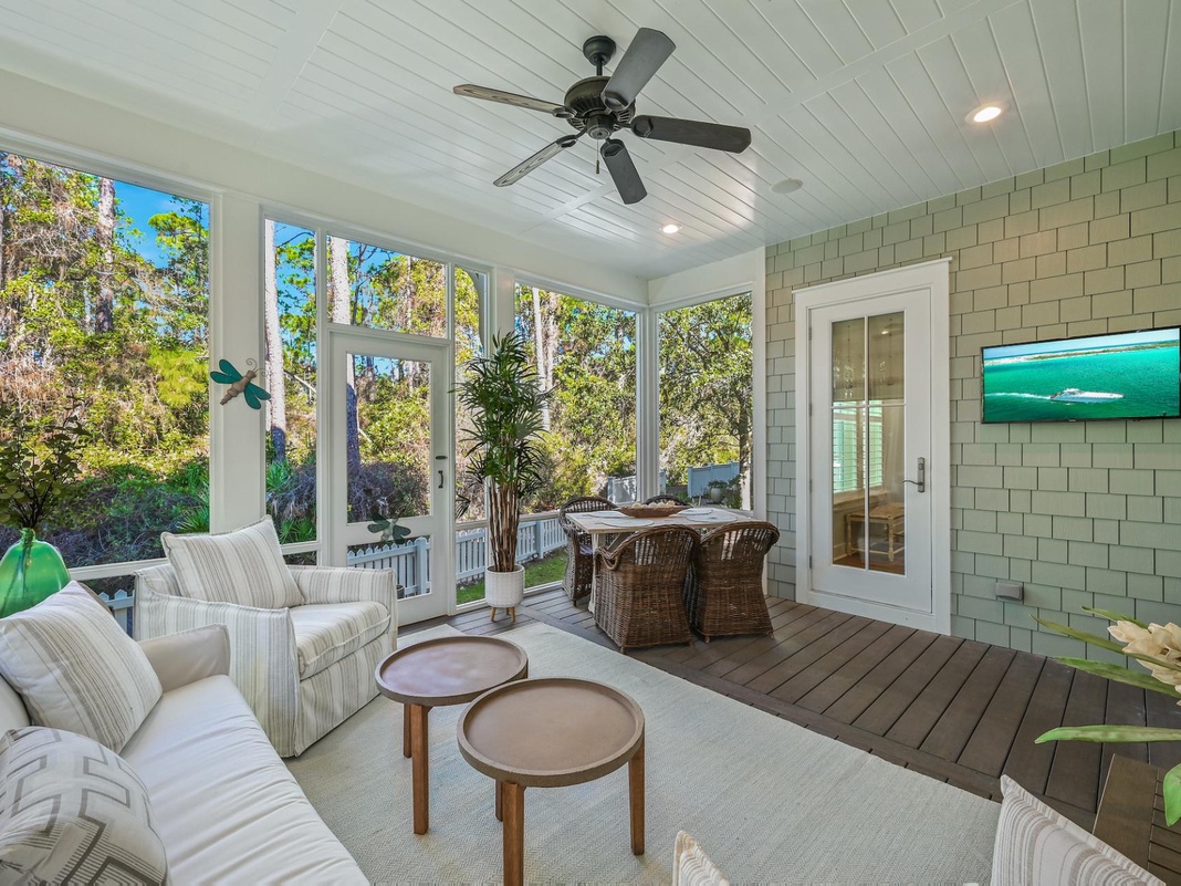This Florida home wouldn’t be complete without the large yard and spacious screened-in porch. With enough room for the whole family, this area has an alfresco dining table, TV, 2 armchairs, and a linen couch. Backing up directly to a wooded area gives you peace and quiet.